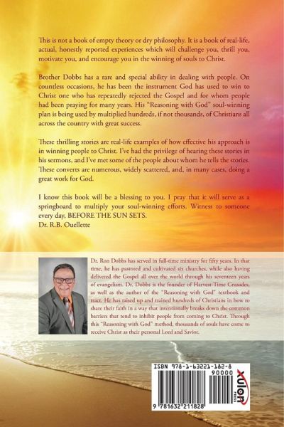 This is not a book of empty theory or dry philosophy. It is a book of real-life, actual, honestly reported experiences which will challenge you, thrill you, motivate you, and encourage you in the winning of souls to Christ.Brother Dobbs has a rare and special ability in dealing with people. On countless occasions, he has been the instrument God has used to win to Christ one who has repeatedly rejected the Gospel and for whom people had been praying for many years. His "Reasoning with God" soul-winning plan is being used by multiplied hundreds, if not thousands, of Christians all across the country with great success.These thrilling stories are real-life examples of how effective his approach is in winning people to Christ. I've had the privilege of hearing these stories in his sermons, and I've met some of the people about whom he tells the stories. These converts are numerous, widely scattered, and, in many cases, doing a great work for God.I know this book will be a blessing to you. I pray that it will serve as a springboard to multiply your soul-winning efforts. Witness to someone every day, BEFORE THE SUN SETS.Dr. R.B. Ouelette Dr. Ron Dobbs has served in full-time ministry for fifty years. In that time, he has pastored and cultivated six churches, while also having delivered the Gospel all over the world through his seventeen years of evangelism. Dr. Dobbs is the founder of Harvest-Time Crusades, as well as the author of the "Reasoning with God" textbook and tract. He has raised up and trained hundreds of Christians in how to share their faith in a way that intentionally breaks down the common barriers that tend to inhibit people from coming to Christ. Through this "Reasoning with God" method, thousands of souls have come to receive Christ as their personal Lord and Savior.