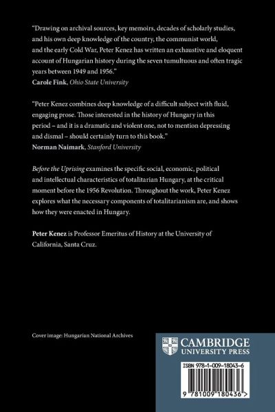 Before the Uprising examines the specific social, economic, political and intellectual characteristics of totalitarian Hungary, at the critical moment before the 1956 Revolution. Throughout the work, Peter Kenez explores what the necessary components of totalitarianism are, and shows how they were enacted in Hungary.