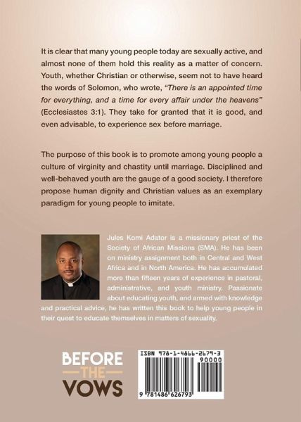It is clear that many young people today are sexually active, and almost none of them hold this reality as a matter of concern. Youth, whether Christian or otherwise, seem not to have heard the words of Solomon, who wrote, "There is an appointed time for everything, and a time for every affair under the heavens" (Ecclesiastes 3:1). They take for granted that it is good, and even advisable, to experience sex before marriage. The purpose of this book is to promote among young people a culture of virginity and chastity until marriage. Disciplined and well-behaved youth are the gauge of a good society. I therefore propose human dignity and Christian values as an exemplary paradigm for young people to imitate.