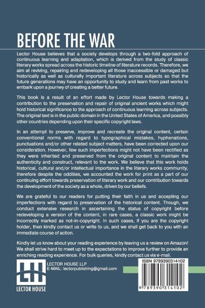Before The War This book is a result of an effort made by us towards making a contribution to the preservation and repair of original classic literature. In an attempt to preserve, improve and recreate the original content, we have worked towards: 1. Type-setting & Reformatting: The complete work has been re-designed via professional layout, formatting and type-setting tools to re-create the same edition with rich typography, graphics, high quality images, and table elements, giving our readers the feel of holding a 'fresh and newly' reprinted and/or revised edition, as opposed to other scanned & printed (Optical Character Recognition - OCR) reproductions. 2. Correction of imperfections: As the work was re-created from the scratch, therefore, it was vetted to rectify certain conventional norms with regard to typographical mistakes, hyphenations, punctuations, blurred images, missing content/pages, and/or other related subject matters, upon our consideration. Every attempt was made to rectify the imperfections related to omitted constructs in the original edition via other references. However, a few of such imperfections which could not be rectified due to intentional\unintentional omission of content in the original edition, were inherited and preserved from the original work to maintain the authenticity and construct, relevant to the work. We believe that this work holds historical, cultural and/or intellectual importance in the literary works community, therefore despite the oddities, we accounted the work for print as a part of our continuing effort towards preservation of literary work and our contribution towards the development of the society as a whole, driven by our beliefs. We are grateful to our readers for putting their faith in us and accepting our imperfections with regard to preservation of the historical content. HAPPY READING!