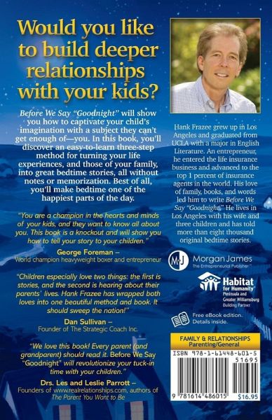 Before We Say "Goodnight" teaches parents how to tell bedtime stories about their life experiences and family history to their children. Parents want to build closer relationships with their kids, but with the hustle and bustle of family schedules where is the time? In Before We Say ?Goodnight? parents will discover an easy-to-learn three-step method for turning their life experiences and those of their family into great bedtime stories, all without notes or memorization. Best of all, they will make bedtime one of the happiest parts of the day.