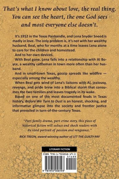 Based on one of the most infamous feuds in Texas history-and incorporating family archives, newspaper accounts and trial transcripts-Before We Turn to Dust is an honest, shocking and masterfully written glimpse into sex, society and justice in early 20th century Texas. It's 1912 in the Texas Panhandle, and Lena Snyder Sneed is madly in love. The only problem is, it's not with her wealthy husband, Beal, who for months at a time leaves Lena alone to care for the children and homestead...and to her own devices. With Beal gone, Lena falls into a relationship with Al Boyce, a wealthy cattleman in town more often than her husband. And in small-town Texas, gossip spreads like wildfire - especially among the wealthy. When Beal gets wind of Lena's liaisons with Al, jealousy, revenge, and pride brew into a Biblical storm that consumes the two families and leaves tragedy in its wake.