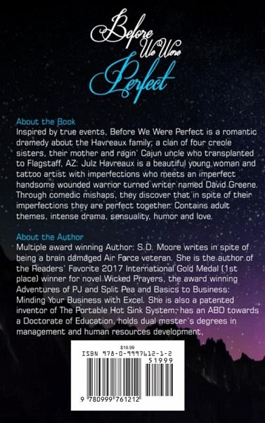 Before We Were Perfect has been adapted into an award winning screenplay titled Perfectly Normal in Flagstaff. The screenplay won Best Feature Script in the 2018 Top Indie Film Awards and a 2018 Silver Screen award in the Nevada International Film Festival. About the Book Inspired by true events, Before We Were Perfect is a romantic dramedy about the Havreaux family; a clan of four creole sisters, their mother and ragin' Cajun uncle who transplanted to Flagstaff, AZ. Julz Havreaux is a beautiful young woman with imperfections who meets an imperfect handsome wounded warrior turned writer named David Greene. Through comedic mishaps, they discover that in spite of their imperfections they are perfect together. Contains adult themes, intense drama, sensuality, humor and love. About the Author Multiple award winning Author: S.D. Moore writes in spite of being a brain damaged, heart damaged Air Force veteran who also battles Lupus. She is the author of the award winning screenplay, Perfectly Normal in Flagstaff which won a 2018 Silver Screen award inthe Nevada International Film Festival. S.D. is also the author of Readers' Favorite 2017 International Gold Medal (1st place) winning horror novel Wicked Prayers, the award winning Adventures of PJ and Split Pea and the workbook Basics to Business: Minding Your Business with Excel. She is also a patented inventor of The Portable Hot Sink System; has an ABD towards a Doctorate of Education, holds dual master's degrees in management and human resources development.