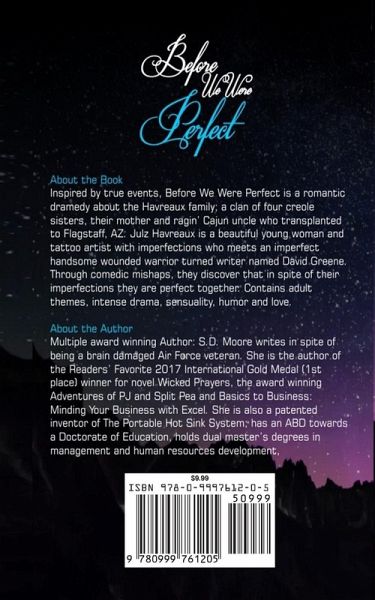 Before We Were Perfect has been adapted into an award winning screenplay titled Perfectly Normal in Flagstaff. The screenplay won Best Feature Script in the 2018 Top Indie Film Awards and a 2018 Silver Screen award in the Nevada International Film Festival. About the Book Inspired by true events, Before We Were Perfect is a romantic dramedy about the Havreaux family; a clan of four creole sisters, their mother and ragin' Cajun uncle who transplanted to Flagstaff, AZ. Julz Havreaux is a beautiful young woman with imperfections who meets an imperfect handsome wounded warrior turned writer named David Greene. Through comedic mishaps, they discover that in spite of their imperfections they are perfect together. Contains adult themes, intense drama, sensuality, humor and love. About the Author Multiple award winning Author: S.D. Moore writes in spite of being a brain damaged, heart damaged Air Force veteran who also battles Lupus. She is the author of the award winning screenplay, Perfectly Normal in Flagstaff which won a 2018 Silver Screen award inthe Nevada International Film Festival. S.D. is also the author of Readers' Favorite 2017 International Gold Medal (1st place) winning horror novel Wicked Prayers, the award winning Adventures of PJ and Split Pea and the workbook Basics to Business: Minding Your Business with Excel. She is also a patented inventor of The Portable Hot Sink System; has an ABD towards a Doctorate of Education, holds dual master's degrees in management and human resources development.
