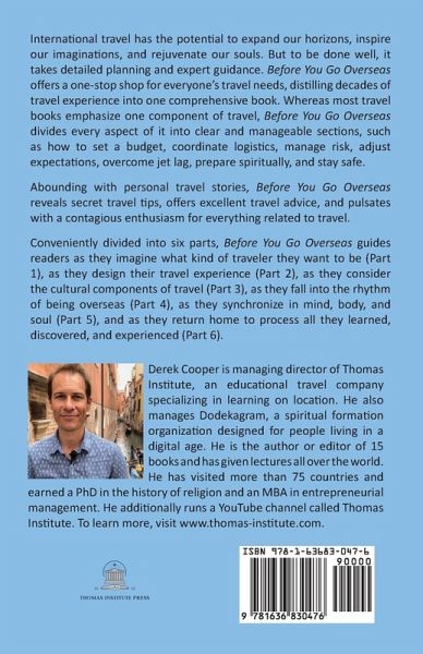 International travel has the potential to expand our horizons, inspire our imaginations, and rejuvenate our souls. But to be done well, it takes detailed planning and expert guidance. Before You Go Overseas offers a one-stop shop for everyone's travel needs, distilling decades of travel experience into one comprehensive book. Whereas most travel books emphasize one component of travel, Before You Go Overseas divides every aspect of it into clear and manageable sections, such as how to set a budget, coordinate logistics, manage risk, adjust expectations, overcome jet lag, prepare spiritually, and stay safe. Abounding with personal travel stories, Before You Go Overseas reveals secret travel tips, offers excellent travel advice, and pulsates with a contagious enthusiasm for everything related to travel. Conveniently divided into six parts, Before You Go Overseas guides readers as they imagine what kind of traveler they want to be (Part 1), as they design their travel experience (Part 2), as they consider the cultural components of travel (Part 3), as they fall into the rhythm of being overseas (Part 4), as they synchronize in mind, body, and soul (Part 5), and as they return home to process all they learned, discovered, and experienced (Part 6).