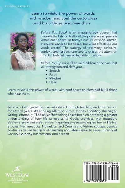 Before You Speak is an engaging eye opener that displays the biblical truths of the power we all possess within our speech. In today's culture of social media, everyone wants to be heard, but what effects do our words create? The synergy of testimony, scriptural context, and research are sure to grasps the attention of individuals influenced by faith or culture. Before You Speak is filled with biblical principles that will strengthen and shift your... ¿ Speech ¿ Faith ¿ Mindset ¿ Heart Learn to wield the power of words with confidence to bless and build those who hear them.