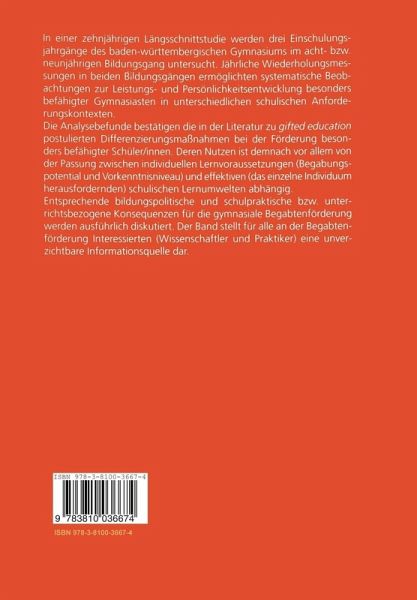In einer zehnjährigen Längsschnittstudie werden drei Einschulungsjahrgänge des baden-württembergischen Gymnasiums im acht- bzw. neunjährigen Bildungsgang untersucht. Jährlich Wiederholungsmessungen in beiden Bildungsgängen ermöglichten systematische Beobachtungen zur Leistungs- und Persönlichkeitsentwicklung besonders befähigter Gymnasiasten in unterschiedlichen schulischen Anforderungskontexten. Die Analysebefunde bestätigen die in der Literatur zu gifted education postulierten Differenzierungsmaßnahmen bei der Förderung besonders befähigter Schüler/innen. Deren Nutzen ist demnach vor allem von der Passung zwischen individuellen Lernvoraussetzungen (Begabungspotential und Vorkenntnisniveau) und effektiven (das einzelne Individuum herausfordernden) schulischen Lernumwelten abhängig. Entsprechende bildungspolitische und schulpraktische bzw. unterrichtsbezogene Konsequenzen für die gymnasiale Begabtenförderung werden ausführlich diskutiert. Der Band stellt für alle an der Begabtenförderung Interessierten (Wissenschaftler und Praktiker) eine unverzichtbare Informationsquelle dar.