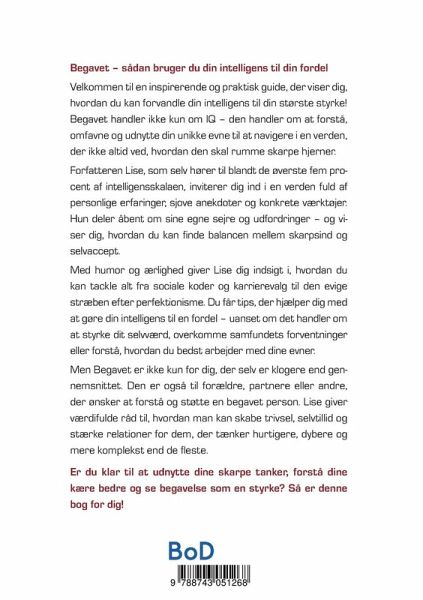Velkommen til en inspirerende og praktisk guide, der viser dig, hvordan du kan forvandle din intelligens til din største styrke! Begavet handler ikke kun om IQ - den handler om at forstå, omfavne og udnytte din unikke evne til at navigere i en verden, der ikke altid ved, hvordan den skal rumme skarpe hjerner. Forfatteren Lise, som selv hører til blandt de øverste fem procent af intelligensskalaen, inviterer dig ind i en verden fuld af personlige erfaringer, sjove anekdoter og konkrete værktøjer. Hun deler åbent om sine egne sejre og udfordringer - og viser dig, hvordan du kan finde balancen mellem skarpsind og selvaccept. Med humor og ærlighed giver Lise dig indsigt i, hvordan du kan tackle alt fra sociale koder og karrierevalg til den evige stræben efter perfektionisme. Du får tips, der hjælper dig med at gøre din intelligens til en fordel - uanset om det handler om at styrke dit selvværd, overkomme samfundets forventninger eller forstå, hvordan du bedst arbejder med dine evner. Men Begavet er ikke kun for dig, der selv er klogere end gennemsnittet. Den er også til forældre, partnere eller andre, der ønsker at forstå og støtte en begavet person. Lise giver værdifulde råd til, hvordan man kan skabe trivsel, selvtillid og stærke relationer for dem, der tænker hurtigere, dybere og mere komplekst end de fleste. Er du klar til at udnytte dine skarpe tanker, forstå dine kære bedre og se begavelse som en styrke? Så er denne bog for dig!