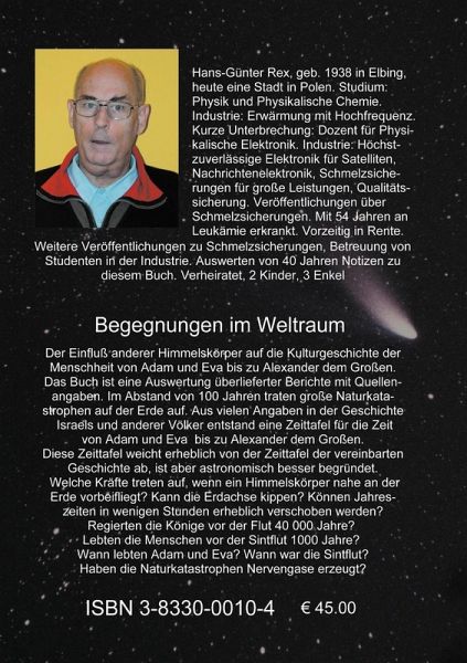 Das Buch ist eine Auswertung überlieferter Berichte mit Quellenangaben. Im Abstand von 100 Jahren traten große Naturkatastrophen auf der Erde auf. Aus vielen Angaben über Namen und Ereignissen in der Geschichte Israels und anderer Völker entstand eine Zeittafel für die Zeit von Adam und Eva bis zu Alexander dem Großen. Diese Zeittafel weicht erheblich von der Zeittafel der konventionellen Geschichte ab, ist aber astronomisch besser begründet. Welche Kräfte treten auf, wenn ein Himmelskörper nahe an der Erde vorbeifliegt? Kann die Erdachse kippen? Können Jahreszeiten in wenigen Stunden erheblich verschoben werden? Regierten einige Könige vor der Flut 40 000 Jahre? Lebten die Menschen vor der Sintflut 1000 Jahre? Wann lebten Adam und Eva? Wann war die Sintflut? Haben die Naturkatastrophen Nervengase erzeugt?