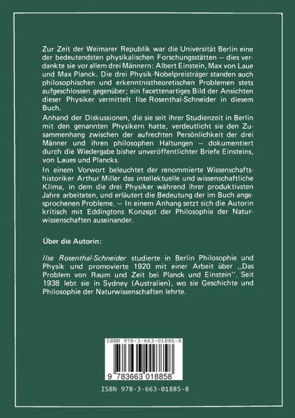 Der Glaube an die Gesetzmäßigkeit der Natur, das Streben, allge meine und universell gültige Gesetze zu finden, und die Hoffnung - oder sogar Erwartung -, der "Wahrheit" über die "Wirklichkeit" näher zu kommen, haben ihren Grund in einer besonderen persönlichen Welt sicht, die tiefere Wurzeln als alle naturwissenschaftlichen Disziplinen und philosophischen Systeme hat. Der persönliche Kontakt mit einem schöpferischen Geist ist anre gend, er verstärkt den Drang nach Verstehen und vergrößert die Be friedigung, wenn Aufklärung zuteil wurde. Wenn dies durch Mathema tik oder eine theoretische Disziplin erfolgt, ist diese Befriedigung dem Vergnügen verwandt, das man an schöner Musik oder anderen wahren Kunstwerken empfindet. Es war mein großes Glück, an der Universität Berlin studieren zu können, als Einstein, von Laue und Planck dort lehrten. Ihr Werk prägte mich stark und dauerhaft. Ich erhielt Einblick in ihr Denken, die ihnen eigenen Methoden und schließlich in ihre Persönlichkeit.Ich möchte einige meiner Erinnerungen in der Hoffnung wiedergeben, ihre Ansichten und ihre Persönlichkeit für die, die sie kannten, lebendig zu erhalten und für alle anderen erstehen zu lassen.
