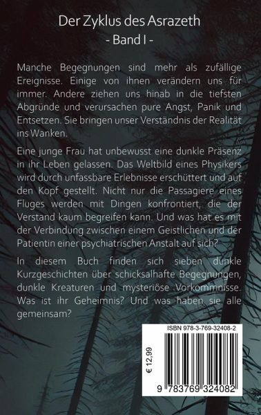 Begegnungen - Dunkle Kurzgeschichten Der Zyklus des Asrazeth - Band I Manche Begegnungen sind mehr als zufällige Ereignisse. Einige verändern uns für immer. Andere ziehen uns hinab in die tiefsten Abgründe und verursachen pure Angst, Panik und Entsetzen. Sie bringen unser Verständnis der Realität ins Wanken. Eine junge Frau hat unbewusst eine dunkle Präsenz in ihr Leben gelassen. Das Weltbild eines Physikers wird durch unfassbare Erlebnisse erschüttert und auf den Kopf gestellt. Nicht nur die Passagiere eines Fluges werden mit Dingen konfrontiert, die der Verstand kaum begreifen kann. Was hat es mit der Verbindung zwischen einem Geistlichen und der Patientin einer psychiatrischen Anstalt auf sich? In diesem Buch finden sich sieben dunkle Kurzgeschichten über schicksalhafte Begegnungen, dunkle Kreaturen und mysteriöse Vorkommnisse. Doch was haben sie alle gemeinsam?