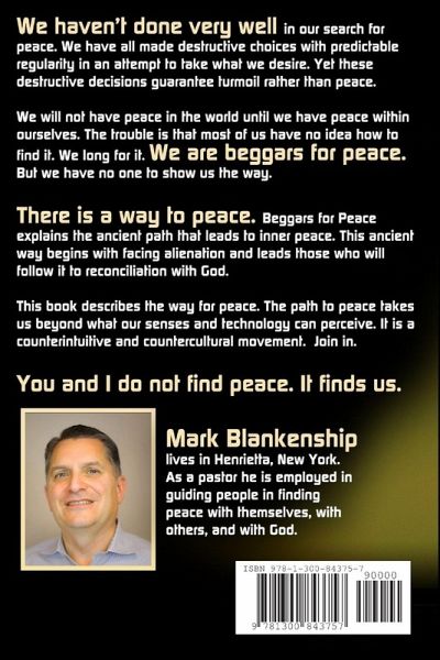 We haven't done very well in our search for peace. We have all made destructive choices with predictable regularity in an attempt to take what we desire. These destructive decisions guarantee turmoil rather than peace. We will not have peace in the world until we have peace within ourselves. The trouble is that most of us have no idea how to find it. We long for it. We are beggars for peace. But we have no one to show us the way. There is a way to peace. Beggars for Peace explains the ancient path that leads to inner peace. This ancient way begins with facing alienation and leads those who will follow it to reconciliation with God. This book describes the way for peace, although not everyone who reads this will see it. The path to peace takes us beyond what our senses and technology can perceive. It is a counterintuitive and countercultural movement. Join in. You and I do not find peace. It finds us.