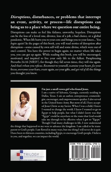 Disruptions, disturbances, or problems that interrupt an event, activity, or process-life disruptions can bring us to a place where we question our entire being. Disruptions can make us feel like failures, unworthy, hopeless. Disruptions can be the loss of a loved one, divorce, loss of a job, a bad choice, or a global pandemic. When life hurts you to your core and brings you to your knees... You begin again! In the pages of this book, you will read stories of disruption after disruption-some caused by own self-will and some divine, which were out of one's control. You have the power to begin again; no matter where life takes you, you can get up again. While reading this book, you will be encouraged, motivated, and inspired to live your only life to the fullest. Paraphrasing Proverbs 24:16 (NRSV), for though they fall seven times, they will rise again. And that's when you refocus. Recommit to yourself, examine your heart, fix your focus, overcome your fears, create again, use your gifts, and get rid of all the things you thought you knew.