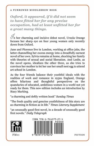 Oxford, it appeared, if it did not seem to have fitted her for any precise occupation, had at least unfitted her for a great many things. In her charming and incisive debut novel, Ursula Orange focuses her sharp eye on four young women only recently down from Oxford. Jane and Florence live in London, working at office jobs, the latter channelling her excess energy into a dreadfully earnest novel of her own. Sylvia remains at home, shocking her family with theories of sexual and social liberation. And Leslie, as the novel opens, idealizes the other three, as she tries to convince her mother to let her use her small nest egg to attend art school in London. As the four friends balance their youthful ideals with the realities of work and romance in 1930s England, Orange offers hilarious and thoughtful perspectives on the quandaries of educated, ambitious women in a world not yet ready for them. This new edition includes an introduction by Stacy Marking. "a charming and deftly written book" Sunday Times "The fresh quality and genuine youthfulness of this story are as charming in fiction as in life." Times Literary Supplement "an unusually good first novel, in a decade of unusually good first novels." Daily Telegraph