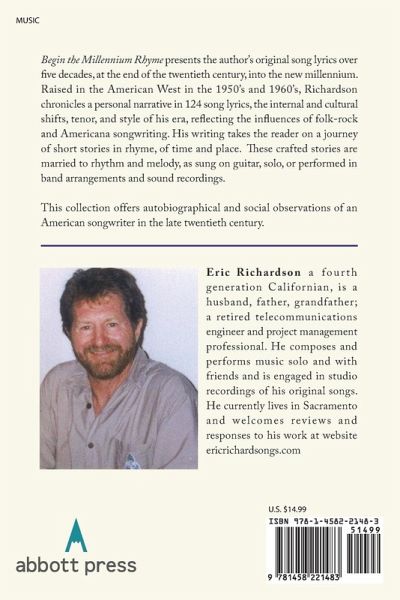 Begin the Millennium Rhyme presents the author's original song lyrics over five decades, at the end of the twentieth century, into the new millennium. Raised in the American West in the 1950's and 1960's, Richardson chronicles a personal narrative in 124 song lyrics, the internal and cultural shifts, tenor, and style of his era, reflecting the influences of folk-rock and Americana songwriting. His writing takes the reader on a journey of short stories in rhyme, of time and place. These crafted stories are married to rhythm and melody, as sung on guitar, solo, or performed in band arrangements and sound recordings. This collection offers autobiographical and social observations of an American songwriter in the late twentieth century.