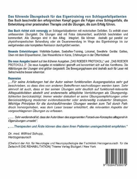 ÜBER DIESES BUCHBEGINNE & GEWINNE FITNESS UND MOBILITÄTVom Rollstuhl zur Fitness und zum normalen Gang durch Eigentraining, Therapie zur Überwindung der spastischen Hemiparese nach Schlaganfall, In den Alltag integrierte Anwendung als kontinuierlicher Verbesserungsprozeß. Optimierung des Gangs, Remobilisierung der Hand, neueste Entwicklungen: WalkAide-System, Saeboflex-Training, Lokomat, bewährte Geräte: Galileo, Üben mit dem Ellipsentrainer, das Wesentliche in Kürze, Erfahrungen in der Öffentlichkeit: Freundliche Gelassenheit und positive Ausstrahlung, Fall-Prophylaxe, Fallen unter Minimierung des Verletzungsrisikos, Unvermeidbare Kollisionen, Kuchenfressende Pelztierchen und andere Zeitgenossen, Über die Wahl von Freunden und Bekannten.Die neue Ausgabe basiert auf den früheren Ausgaben "DAS ROEDER PROTOKOLL" und "DAS ROEDER PROTOKOLL 2". Die neue Ausgabe ist redaktionell gestrafft und konzentriert auf das Kernthema. Die Abbildungen der Übungen sind größer dargestellt. Die Bewegungsphasen sind deshalb auch für Leser mit Sehschwäche besser erkennbar.Das führende Übungsbuch für das Eigentraining von Schlaganfallpatienten Das Buch beschreibt den erfolgreichen Kampf gegen die Folgen eines Schlaganfalls, die Entwicklung einer praxisnahen Therapie und die Übungen, die zum Erfolg führen.Das Buch richtet sich vorrangig an Schlaganfallpatienten mit motorischen Defiziten, wie auch an interessierte Physiotherapeuten und Ärzte im Sektor neurologische Rehabilitation. Es enthält einen umfassenden Übungsteil. Die Übungen sind mit Fotos dokumentiert, ausführlich beschrieben und kommentiert. Alle Übungen sind in den Alltag integriert. Sie können deshalb gut parallel zur physiotherapeutischen Behandlung oder als Daueranwendung im Wege desEigentrainings bis zur weitgehenden oder kompletten Remission durchgeführt werden.Elemente des Therapiekonzepts: 24Stunden-Management _ Integration aller Übungen in den Tagesablauf _ Elemente des Bobath-Konzepts _ modifizierte Feldenkrais Übungen _ modifizierte Tai-Chi Übungen _ Motomed-Training _ IMF-Therapie Intensionsgesteuertes Myofeedback _ Trainingsprogramm _ standardisierte Eigentrainings-Pläne mit etwa 50 mit der Atmung synchronisierten Dehn- und Bewegungsübungen. _ PMR Progressive Muskelrelaxion nach Jacobson _ Unterstützung der adulten Neurogenese nach Kempermann _ Medikamentöse Unterstützung lt. Leitlinien der AWMF _ Erprobung der Medikamente und adäquater Dosierungsschemata _ Verwendung von Hilfsmitteln zur Erzwingung korrekter "Postural Sets"http://web.me.com/frank_roeder/FRANK_W._D._ROEDER/Willkommen.html