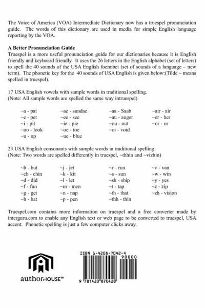 This dictionary of USA English is directly taken from the Voice of America (VOA) "Intermediate Dictionary of English." There are about 1,500 words in the dictionary. The VOA uses these words primarily for broadcasting in a simplified English mode. The words and definitions in this book are exactly as in the VOA version. However, because there is no pronunciation guide in the VOA version, a truespel pronunciation guide is provided modeled after the voicings of English on m-w.com, the Merriam-Webster talking dictionary. Unique to this dictionary is a reverse guide that lists phonetic words alphabetically so they can be looked up phonetically. This solves the problem of silent first letters. A large volume reverse dictionary will be available as truespel book 2. More info is available at truespel.com.