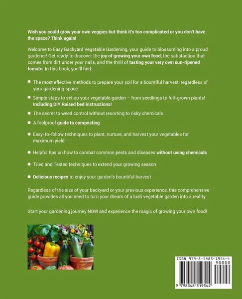 Wish you could grow your own veggies but think it's too complicated or you don't have the space? Think again! Welcome to Easy Backyard Vegetable Gardening, your guide to blossoming into a proud gardener! Get ready to transform your backyard into an overflowing oasis of delicious vegetables. Discover the joy of growing your own food, the satisfaction that comes from dirt under your nails, and the thrill of tasting your very own sun-ripened tomato. In this book, you'll find: * The most effective methods to prepare your soil for a bountiful harvest, regardless of your gardening space * Simple steps to set up your vegetable garden - from seedlings to full-grown plants! Including DIY Raised bed instructions! * The secret to weed control without resorting to risky chemicals * A foolproof guide to composting * Easy-to-follow techniques to plant, nurture, and harvest your vegetables for maximum yield * The art of rotation planting to maintain a healthy soil year round * Helpful tips on how to combat common pests and diseases without using chemicals * Tried and Tested techniques to extend your growing season * Delicious recipes to enjoy your garden's bountiful harvest You might be a novice gardener or think you're lacking a green thumb. Fear not. This book is designed with you in mind. You'll discover the joy of gardening, that green thumb hiding within, and the perks of growing your food. Regardless of the size of your backyard or your previous experience, this comprehensive guide provides all you need to turn your dream of a lush vegetable garden into a reality. Start your gardening journey NOW and experience the magic of growing your own food!