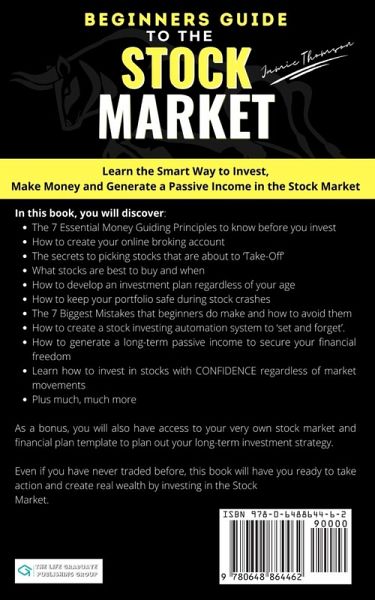 Learn the Smart Way to Invest, Make Money and Generate a Passive Income in the Stock Market The Stock Market can be a 'Financial Game Changer' for anyone that invests their time to learn about how to do it the Smart-Way, but sadly, many miss out on the great money-making machine of the stock market. But why? * They don't know where to start. It all seems too complicated! * They hear that the stock market is 'too risky' and are afraid to invest. * They are unsure how much to invest, where to invest and when to invest. * They have invested before; they lost their money and are cautious about trying again. * There is too much terminology to understand. If you want to make money as a beginner in the stock market, you need to learn the investment principles that the experts teach that will provide a long-term and passive income that you can depend upon. Jamie Thomson brings together the exact methods that he's been teaching to stock investors for over 20 years, and now you too can benefit from his vast knowledge and experience from the 'Beginners Guide to the Stock Market'. This book will teach you all the strategies you need to start while avoiding the costly mistakes that beginners do make. In this book, you will discover: * The 7 Essential Money Guiding Principles to know before you invest * How to create your online broking account * The secrets to picking stocks that are about to 'Take-Off' * What stocks are best to buy and when * How to develop an investment plan regardless of your age * How to keep your portfolio safe during stock crashes * The 7 Biggest Mistakes that beginners do make and how to avoid them * How to create a stock investing automation system so you can 'set and forget'. * How to generate a long-term passive income to secure your financial freedom * Learn how to invest in stocks with CONFIDENCE regardless of market movements * Plus much, much more As a bonus, you will also have access to your very own stock market and financial plan template to plan out your long-term investment strategy. Even if you have never traded before, this book will have you ready to take action and create real wealth by investing in the Stock Market.