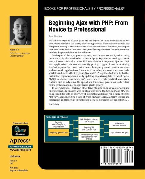 Beginning Ajax with PHP: From Novice to Professional is the first book to introduce how these two popular technologies can work together to create next-generation applications. Author Lee Babin covers what you commonly encounter in daily web application development tasks, and shows you how to build PHP/Ajax-enabled solutions for forms validation, file upload monitoring, database-driven information display and manipulation, web services, Google Maps integration, and more.