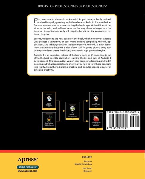 With Beginning Android 2, you'll learn how to develop applications for Android 2.x mobile devices, using simple examples that are ready to run with your copy of the software development kit. Author, Android columnist, writer, developer, and community advocate Mark L. Murphy will show you what you need to know to get started programming Android applications, including how to craft graphical user interfaces, use GPS, and access web services.