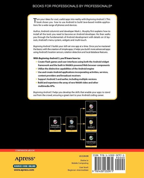 With Beginning Android 3, you'll learn how to develop applications for Android 3 mobile devices using simple examples that are ready to run with your copy of the software development kit. Author, Android columnist, developer, and community advocate Mark L. Murphy will show you what you need to know to get started programming Android applications, including how to craft graphical user interfaces, use GPS, multi-touch, multi-tasking, and access web services.