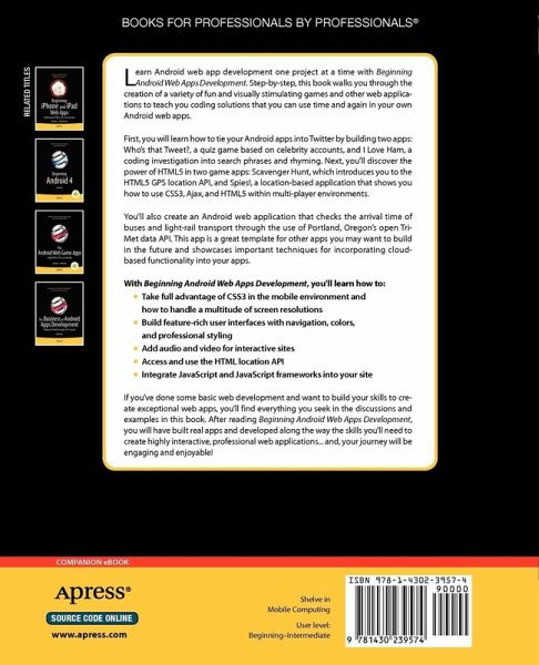 Your Android web app development skills will then proceed in another direction, as you discover the power of HTML5 in two game apps: Scavenger Hunt, which introduces you to the HTML5 GPS location API, and Spies!, a location-based application that shows you how to use CSS3, Ajax, and HTML5 within multi-player environments. You'll also create an Android web application which checks the arrival time of buses and light-rails through the use of Portland, Oregon's open Tri-Met data API! This app is a great template for other apps you may want to build in the future, and showcases the important techniques for incorporating cloud-based apps into web games. After reading Beginning Android Web Apps Development, you will have built real apps and developed along the way the skills you'll need to create highly interactive, professional web applications... and, your journey will be engaging and enjoyable!