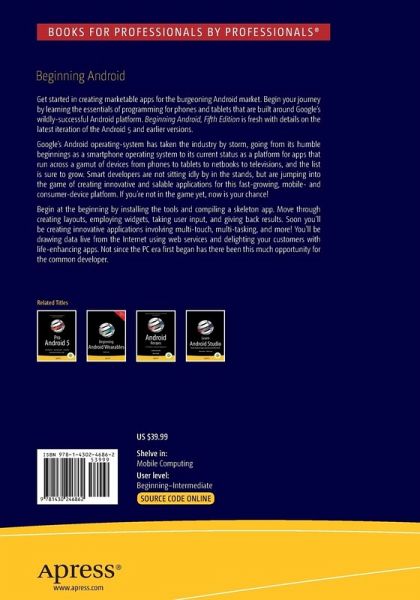 Get started in creating marketable apps for the burgeoning Android market. Begin your journey by learning the essentials of programming for phones and tables that are built around Google's wildly-successful Android platform. Beginning Android, Fifth Edition is fresh with details on the latest iteration of the Android 5 and earlier versions.