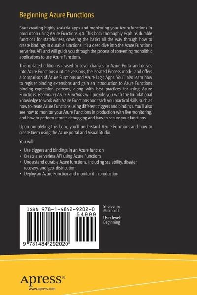 This updated edition is revised to cover changes to Azure Portal and delves into Azure Functions runtime versions, the Isolated Process model, and offers a comparison of Azure Functions and Azure Logic Apps. You'll also learn how to register binding extensions and gain an introduction to Azure Functions binding expression patterns, along with best practices for using Azure Functions. Beginning Azure Functions will provide you with the foundational knowledge to work with Azure Functions and teach you practical skills, such as how tocreate Azure Functions using different triggers and bindings. You'll also see how to monitor your Azure Functions in production with live monitoring, and how to perform remote debugging and how to secure your functions.
