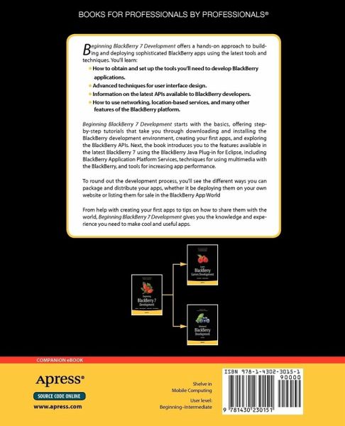 Are you interested in creating BlackBerry apps using the latest BlackBerry 7 and BlackBerry Java Plug-in for Eclipse? Then this is the book for you. Beginning BlackBerry 7 Development offers a hands-on approach to learning how to build and deploy sophisticated BlackBerry apps using the latest tools and techniques available.