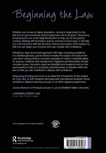 Whether you're new to higher education, coming to legal study for the first time or just wondering what Employment Law is all about, Beginning Employment Law is the ideal introduction to help you hit the ground running. Starting with the basics and an overview of each topic, it will help you come to terms with the structure, themes and issues of the subject so that you can begin your Employment Law module with confidence. Adopting a clear and simple approach with legal vocabulary explained in a detailed glossary, James Marson breaks the subject of Employment Law down using practical everyday examples to make it understandable for anyone, whatever their background. Diagrams and flowcharts simplify complex issues, important cases are identified and explained and on-the- spot questions help you recognise potential issues or debates within the law so that you can contribute in classes with confidence. Beginning Employment Law is an ideal first introduction to the subject for LLB, GDL or ILEX and especially international students, those enrolled on distance learning courses or on other degree programmes.