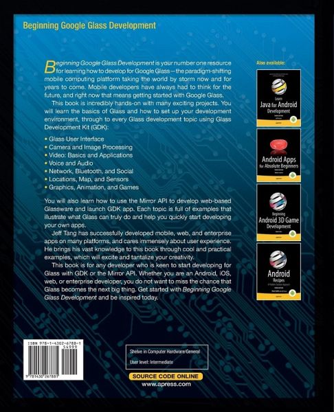You will also learn how to develop enterprise and web-based Glass apps using the Mirror API. Each topic is full of examples that illustrate what Glass can truly do and help you quickly start developing your own apps.