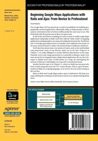The Google Maps API remains one of the showcase examples of the Web 2.0 development paradigm. Beginning Google Maps Applications with Rails and Ajax: From Novice to Professional is the first book to comprehensively introduce the service from a developer perspective, showing you how you can integrate mapping features into your Rails-driven web applications.