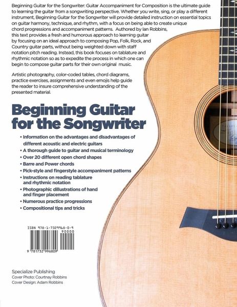 Beginning Guitar for the Songwriter: Guitar Accompaniment for Composition is the ultimate guide to learning the guitar from a songwriting perspective. Whether you write, sing, or play a different instrument, Beginning Guitar for the Songwriterwill provide detailed instruction on essential topics on guitar harmony, technique, and rhythm, with a focus on being able to create unique chord progressions and accompaniment patterns. Authored by Ian Robbins, this text provides a fresh and humorous approach to learning guitar by focusing on an ideal approach to composing Pop, Folk, Rock, and Country guitar parts, without being weighted down with staff notation pitch reading. Instead, this book focuses on tablature and rhythmic notation so as to expedite the process in which one can begin to compose guitar parts for their own original music. Artistic photography, color-coded tables, chord diagrams, practice exercises, assignments and even emojis help guide the reader to insure comprehensive understanding of the presented material. Beginning Guitar for the Songwriter includes: Information on the advantages and disadvantages of different acoustic and electric guitars A thorough guide to guitar and musical terminology Over 20 different open chord shapes Barre and Power chords Pick-style and fingerstyle accompaniment patterns Instructions on reading tablature and rhythmic notation Photographic dillustrations of hand and finger placement Numerous practice progressions Compositional tips and tricks