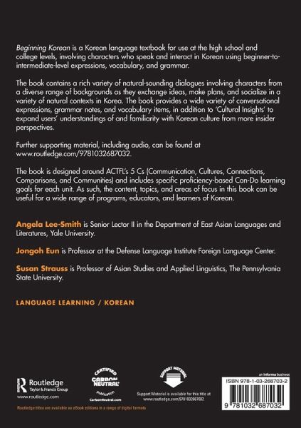Angela Lee-Smith is Senior Lector II in the Department of East Asian Languages and Literatures, Yale University. Jongoh Eun is Professor at the Defense Language Institute Foreign Language Center. Susan Strauss is Professor of Asian Studies and Applied Linguistics, The Pennsylvania State University.