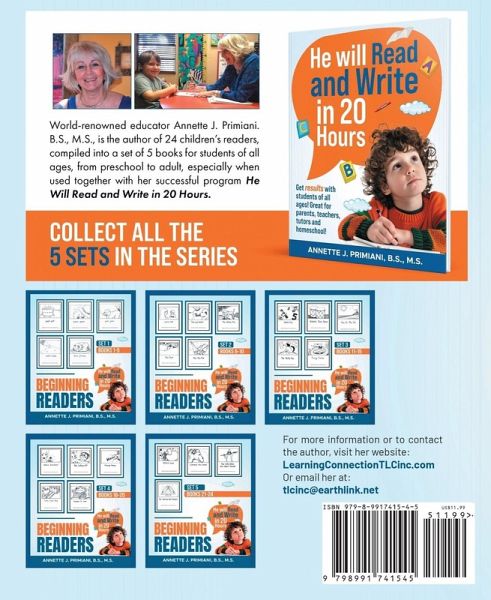 This book is called Set 3 in the series of 5 Beginning Readers. It is for use with most beginning reading programs today and particularly the successful He Will Read and Write in 20 Hours program delivered by Annette J. Primiani, M.S., B. S. She advises: "Set 1 contains the shortest and easiest stories. It's best to start with Set 1 and continue onwards as your child advances. They allow the student to read words with carefully chosen short vowels and several consonants. There are 5 book sets, each one carrying on with the next gradient step of simple readers for your child." With Set 3, you receive one book that includes the following Beginning Readers: Math Fun Matt's Tom-Toms Fun in the Sun The Nutty Pup Funny Emma