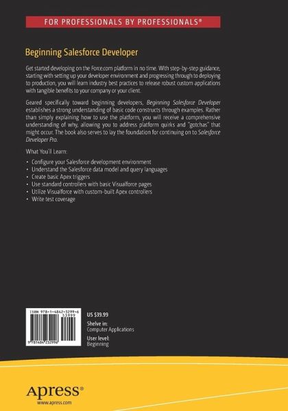 Geared specifically toward beginning developers, Beginning Salesforce Developer establishes a strong understanding of basic code constructs through examples. Rather than simply explaining how to use the platform, you will receive a comprehensive understanding of why, allowing you to address platform quirks and "gotchas" that might occur. The book also serves to lay the foundation for continuing on to Salesforce Developer Pro.