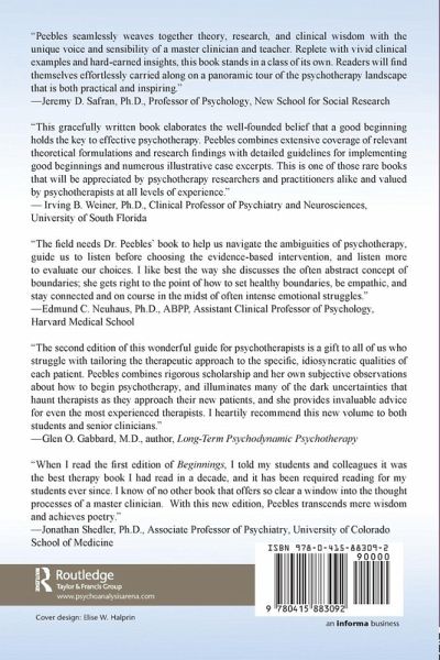 "When I read the first edition of Beginnings, I told my students and colleagues it was the best therapy book I had read in a decade, and it has been required reading for my students ever since. I know of no other book that offers so clear a window into the thought processes of a master clinician. With this new edition, Peebles transcends mere wisdom and achieves poetry." - Jonathan Shedler, Ph.D., Associate Professor of Psychiatry, University of Colorado School of Medicine
