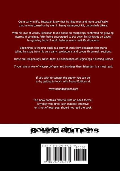 Quite early in life, Sebastian knew that he liked men rather than women; more specifically, that he was turned on by men in heavy waterproof kit, particularly bikers. Books on escapology confirmed a growing interest in bondage. Youthful experiences grew more sophisticated; friendships with people with similar interests were established and maintained. One of these friends encouraged Sebastian to start writing, an initial few words has grown into a large collection of stories; each story has a true event as a jumping off point and the detail in them is deliberate because ideas and plans from the stories have been used in encounters and sessions. Sebastian lives and works in the south east of the UK; he continues to write and do what he enjoys doing. Beginnings is the first stories from Sebastian and contain: Beginnings Next Steps: a Continuation of Beginnings Closing Games A must for any fan of waterproof gear and bondage.