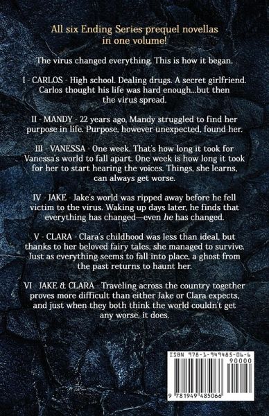 All six The Ending Series prequel novellas in one volume! The virus changed everything. This is how it began. I - CARLOS High school. Dealing drugs. A secret girlfriend. Carlos thought his life was hard enough...but then the virus spread. II - MANDY 22 years ago, Mandy struggled to find her purpose in life. Purpose, however unexpected, found her. III - VANESSA One week. That's how long it took for Vanessa's world to fall apart. One week is how long it took for her to start hearing the voices. Things, she learns, can always get worse. IV - JAKE Jake's world was ripped away shortly before he fell victim to the virus. Waking up days later, he finds that everything has changed--even he has changed. V - CLARA Clara's childhood was less than ideal, but thanks to her beloved fairy tales, she managed to survive. Just as everything seems to be falling into place, a ghost from the past returns to haunt her. VI - JAKE & CLARA Traveling across the country together proves more difficult than either Jake or Clara expects, and just when they both think the world couldn't get any worse, it does. THE ENDING SERIES: After The Ending Into The Fire Out Of The Ashes Before The Dawn The Ending Beginnings: A Collection of Stories World Before: A Collection of Stories