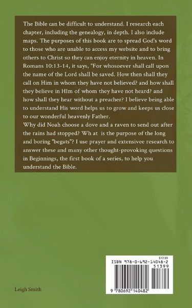 The Bible can be difficult to understand. I research each chapter, including the genealogy, in depth. I also include maps. The purposes of this book are to spread God's word to those who are unable to access my website and to bring others to Christ so they can enjoy eternity in heaven. In Romans 10:13-14, it says, "For whosoever shall call upon the name of the Lord shall be saved. How then shall they call on Him in whom they have not believed? and how shall they believe in HIm of whom they have not heard? and how shall they hear without a preacher? I believe being able to understand His word helps us to grow and keeps us close to our wonderful heavenly Father. Why did Noah choose a dove and a raven to send out after the rains had stopped? Wh at is the purpose of the long and boring "begats"? I use prayer and extensivee research to answer these and many other thought-provoking questions in Beginnings, the first book of a series, to help you understand the Bible.