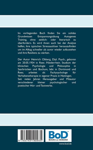 Im vorliegenden Buch finden Sie ein solides Grundwissen Entspannungsübung Autogenes Training, ohne zeitlich oder literarisch zu überfordern. Es wird ihnen auch bei der Analyse helfen, ihre typischen Stressauslöser herauszufinden um im Alltag schneller als zuvor wieder aufzustehen und ihre Resilienz zu stärken.Der Autor Heinrich Obberg, Dipl. Psych., geboren am 20.05.1954 in Rees /Niederrhein. Studium der klinischen Psychologie und Philosophie in Saarbrücken und Bochum, lebt in Dortmund und Rees; arbeitet als Fachpsychologe für Verhaltenstherapie in eigener Praxis in Hattingen.Seit vielen Jahren Herausgeber und Mitautor verschiedener kleiner psychologischer und poetischer Hör- und Textwerke.