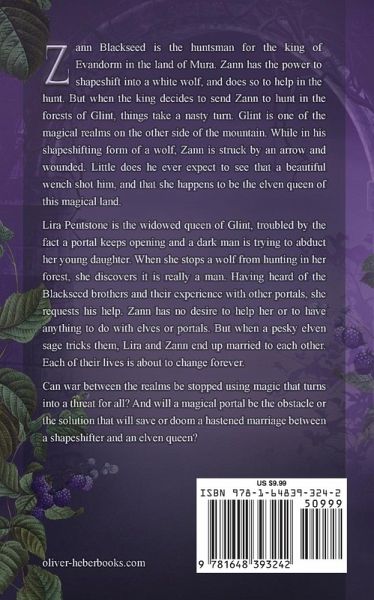 * When the darkness of despair casts shadows on life, the spark of hope flickers, just waiting to burst into flame once more.* Zann Blackseed is the huntsman for the king of Evandorm in the land of Mura. Zann has the power to shapeshift into a white wolf, and does so to help in the hunt. But when the king decides to send Zann to hunt in the forests of Glint, things take a nasty turn. Glint is one of the magical realms on the other side of the mountain. While in his shapeshifting form of a wolf, Zann is struck by an arrow and wounded. Little does he ever expect to see that a beautiful wench shot him, and that she happens to be the elven queen of this magical land. Lira Pentstone is the widowed queen of Glint, troubled by the fact a portal keeps opening and a dark man is trying to abduct her young daughter. When she stops a wolf from hunting in her forest, she discovers it is really a man. Having heard of the Blackseed brothers and their experience with other portals, she requests his help. Zann has no desire to help her or to have anything to do with elves or portals. But when a pesky elven sage tricks them, Lira and Zann end up married to each other. Each of their lives is about to change forever. Can war between the realms be stopped using magic that turns into a threat for all? And will a magical portal be the obstacle or the solution that will save or doom a hastened marriage between a shapeshifter and an elven queen?