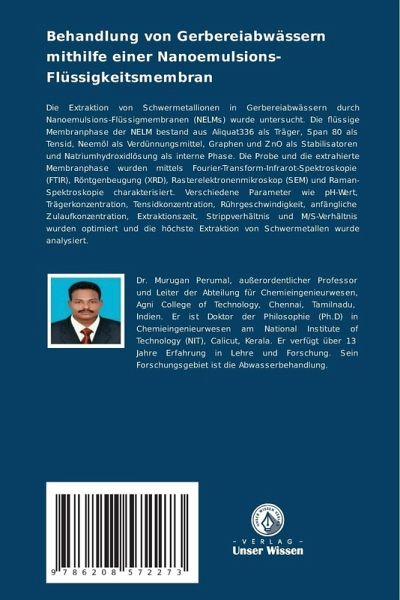 Die Extraktion von Schwermetallionen in Gerbereiabwässern durch Nanoemulsions-Flüssigmembranen (NELMs) wurde untersucht. Die flüssige Membranphase der NELM bestand aus Aliquat336 als Träger, Span 80 als Tensid, Neemöl als Verdünnungsmittel, Graphen und ZnO als Stabilisatoren und Natriumhydroxidlösung als interne Phase. Die Probe und die extrahierte Membranphase wurden mittels Fourier-Transform-Infrarot-Spektroskopie (FTIR), Röntgenbeugung (XRD), Rasterelektronenmikroskop (SEM) und Raman-Spektroskopie charakterisiert. Verschiedene Parameter wie pH-Wert, Trägerkonzentration, Tensidkonzentration, Rührgeschwindigkeit, anfängliche Zulaufkonzentration, Extraktionszeit, Strippverhältnis und M/S-Verhältnis wurden optimiert und die höchste Extraktion von Schwermetallen wurde analysiert.