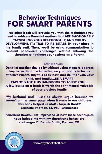 HEY PARENTS... DON'T LOOSE YOUR COOL !!!...BE SMART BUT WITH PROVEN BEHAVIOR TECHNIQUES !!! It's time to get your relationship with YOUR CHILDREN back on track ! Once you use our step by step guide, Parenting will be one of the easiest part of your daily activities. No other book will provide you with the techniques you need to address Parental matters that ARE TARNISHING YOUR RELATIONSHIP, AND CHILD'S DEVELOPMENT. IT'S TIME TO RE-ESTABLISH your place in YOUR FAMILY UNIT. Then, you'll be using communication to confront behavioral challenges without allowing the situation to navigate irrational responses.You are ready for positive change because you believe in essential techniques that work for your situation with your children. A few bucks on a book is worth the sentimental valuable of your precious family.Your children need Effective Parenting. Now is the time to fix the problem ! The secrets in this book reveal specific techniques that you should be using with your child to maintain a healthy family unit !
