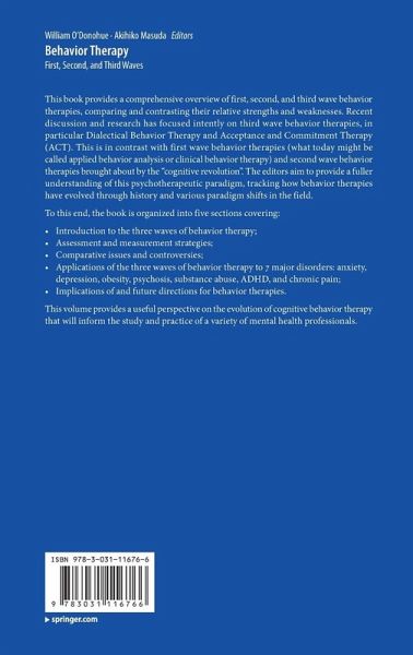 Introduction to the three waves of behavior therapyAssessment and measurement strategiesComparative issues and controversiesApplicationsof the three waves of behavior therapy to 7 major disorders: anxiety, depression, obesity, psychosis, substance abuse, ADHD, and chronic painImplications of and future directions for behavior therapiesThis volume provides a useful perspective on the evolution of cognitive behavior therapy that will inform the study and practice of a variety of mental health professionals.