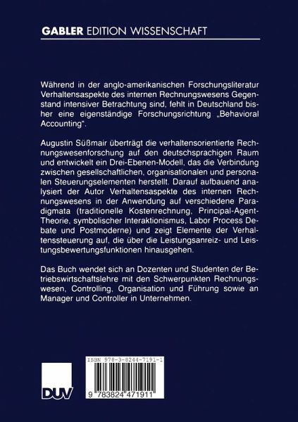 Augustin Süßmair überträgt die verhaltensorientierte Rechnungswesenforschung auf den deutschsprachigen Raum und entwickelt ein Drei-Ebenen-Modell, das die Verbindung zwischen gesellschaftlichen, organisationalen und personalen Steuerungselementen herstellt.