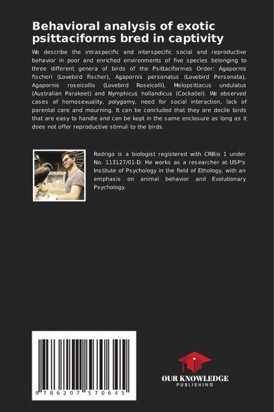 We describe the intraspecific and interspecific social and reproductive behavior in poor and enriched environments of five species belonging to three different genera of birds of the Psittaciformes Order: Agapornis fischeri (Lovebird Fischer), Agapornis personatus (Lovebird Personata), Agapornis roseicollis (Lovebird Roseicolli), Melopsittacus undulatus (Australian Parakeet) and Nymphicus hollandicus (Cockatiel). We observed cases of homosexuality, polygamy, need for social interaction, lack of parental care and mourning. It can be concluded that they are docile birds that are easy to handle and can be kept in the same enclosure as long as it does not offer reproductive stimuli to the birds.