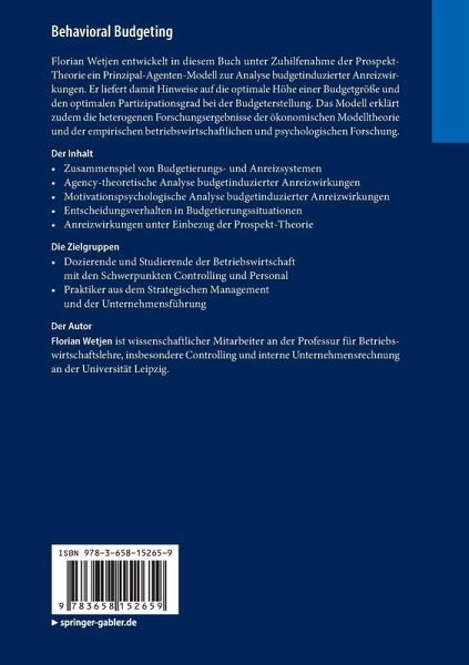 Florian Wetjen entwickelt in diesem Buch unter Zuhilfenahme der Prospekt-Theorie ein Prinzipal-Agenten-Modell zur Analyse budgetinduzierter Anreizwirkungen. Er liefert damit Hinweise auf die optimale Höhe einer Budgetgröße und den optimalen Partizipationsgrad bei der Budgeterstellung. Das Modell erklärt zudem die heterogenen Forschungsergebnisse der ökonomischen Modelltheorie und der empirischen betriebswirtschaftlichen und psychologischen Forschung.