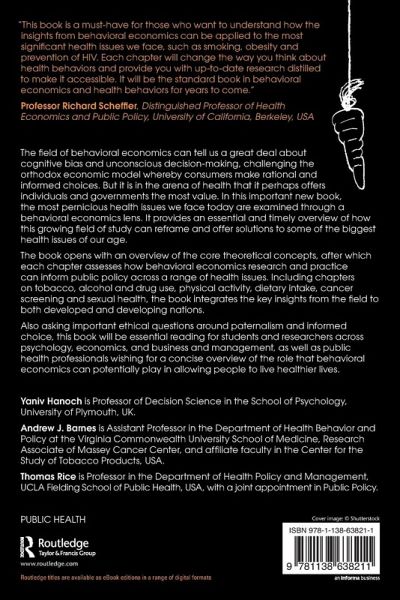 The field of behavioural economics can tell us a great deal about cognitive bias and unconscious decision-making, challenging the orthodox economic model whereby consumers make rational and informed choices. But it is in the arena of health that it perhaps offers individuals and governments the most value. In this important new book, the most pernicious health issues we face today are examined through a behavioral economic lens. It provides an essential and timely overview of how this growing field of study can reframe and offer solutions to some of the biggest health issues of our age. The book opens with an overview of the core theoretical concepts, after which each chapter assesses how behavioral economic research and practice can inform public policy across a range of health issues. Including chapters on tobacco, alcohol and drug use, physical activity, dietary intake, cancer screening and sexual health, the book integrates the key insights from the field to both developed and developing nations. Also asking important ethical questions around paternalism and informed choice, this book will be essential reading for students and researchers across psychology, economics and business and management, as well as public health professionals wishing for a concise overview of the role behavioral economics can potentially play in allowing people to live healthier lives.